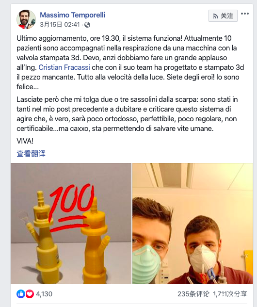 上週四,意大利北部倫巴第大區佈雷西亞省基亞里的一家地方醫院,緊急需要一種呼吸設備上用於吸氧的特殊閥門,以幫助因為冠狀病毒來到ICU的病人。