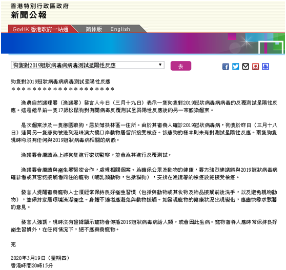公報稱,香港漁護署會繼續與衞生署緊密合作,處理相關個案。為確保公眾及動物的健康,署方強烈建議將與新冠肺炎確診者或其密切接觸者同住的寵物(哺乳類動物,包括貓狗),安排在漁護署的檢疫設施接受檢疫。