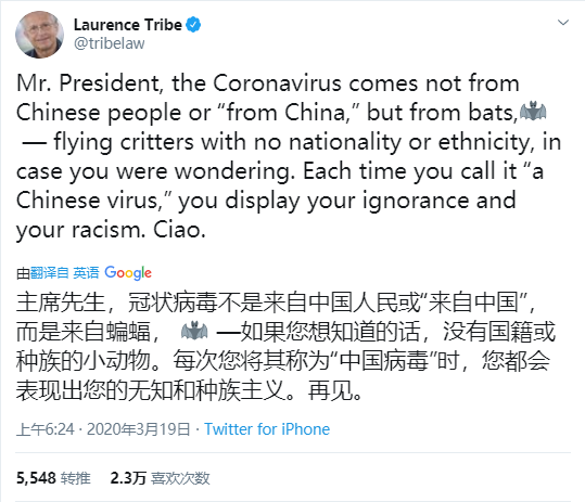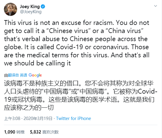 在推特上,大量外國網友呼籲不要讓“1918年大流感”被稱為“西班牙大流感”的事情再次發生在中國身上。網友“LaurenceTribe”的一條推特得到上萬個點贊,“冠狀病毒不是來自中國人民或‘來自中國’……每次你稱其為‘中國病毒’時,你都會表現出無知和種族主義。”
