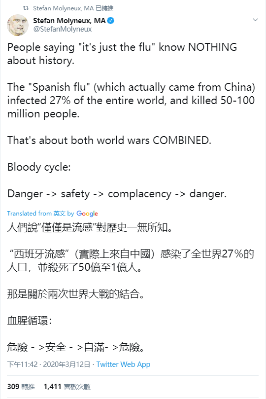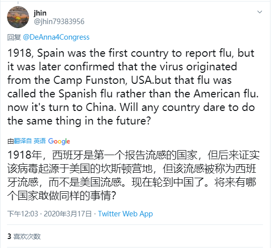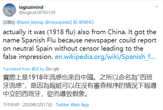 或許是受到維基百科內容誤導,在美國社交媒體推特上,已經有不少人開始宣稱“1918年大流感”正是“來源於中國”。