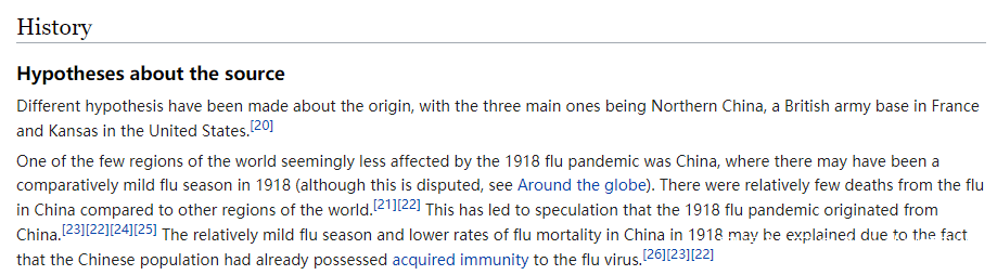 在12日“Aréat”的修改版本中,中國不僅被列為“1918年大流感”的可能來源地第一位,“關於來源的假設”部分的第二段也被修改為下列內容:“中國是世界上受1918年流感大流行影響較小的少數地區之一,中國在1918年可能有一個相對温和的流感季節。與世界其他地區相比,中國死於流感的人數相對較少。這導致人們猜測1918年的流感大流行起源於中國。1918年中國相對温和的流感季節和較低的流感死亡率可能是由於中國人已經獲得了對流感病毒的免疫力這一事實造成的。”根據註釋,上述內容的來源均為2014年以前發表的2篇文章,並非最新的研究成果,但在3月前後被引用加入到“1918年大流感”的可能來源地中。