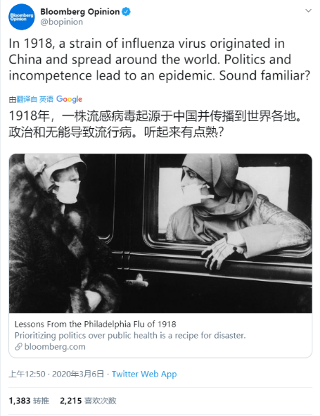 試圖把中國與“1918年大流感”聯繫起來的人不僅存在於維基百科和社交媒體上,彭博社本月6日發表的一篇文章稱,“1918年,一株流感病毒起源於中國並傳播到世界各地。聽起來有點耳熟”,也把中國稱為“1918年大流感”的起源地,且沒有提到這是一個有爭議的問題。