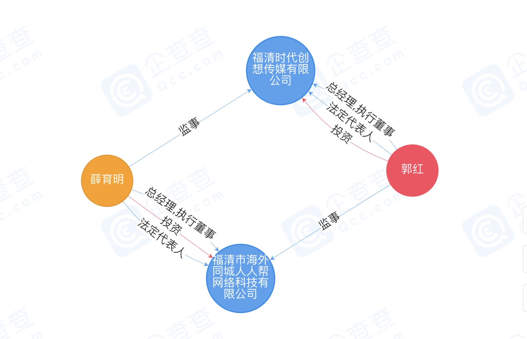 另據顯示,薛育明系“海外同城人人幫”的總經理、執行董事,並擔任其妻子郭紅名下公司——“時代創想傳媒”的監事,而郭紅本人亦為“海外同城人人幫”的監事。而另一家公司“天天快幫”,掛在郭紅的哥哥郭仕強名下。郭紅、郭仕強在接受新京報記者採訪時稱,對此事並不知情,由薛育明在具體負責打理。