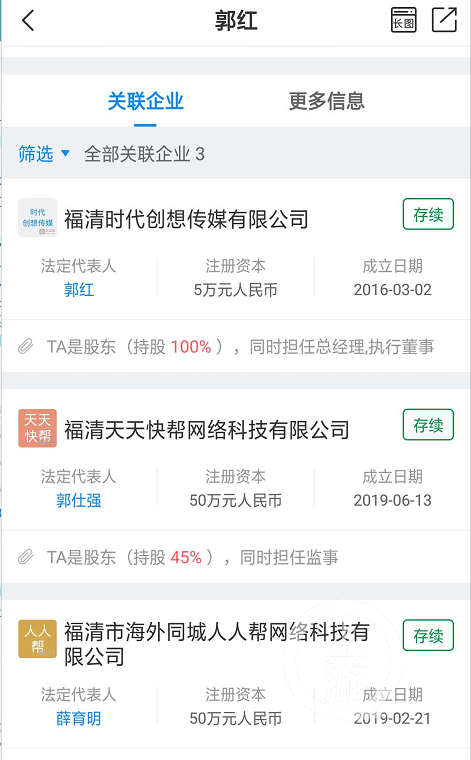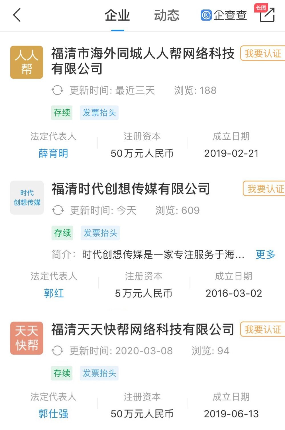 新京報記者最新檢索發現,據工商註冊信息,發佈類似文章的公眾號運營主體,涉及三家公司:福清天天快幫網絡科技有限公司(下簡稱“天天快幫”),法定代表人為郭仕強;福清時代創想傳媒有限公司(下簡稱“時代創想傳媒”),法定代表人郭紅;福清市海外同城人人幫網絡科技有限公司(下簡稱“海外同城人人幫”),法定代表人薛育明。