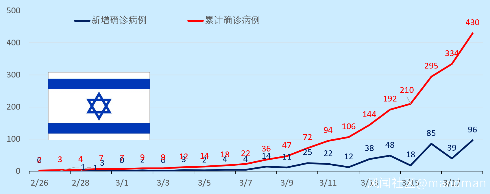 以色列:新增96例,快速增長,累計430例,百萬人口確診率為48。