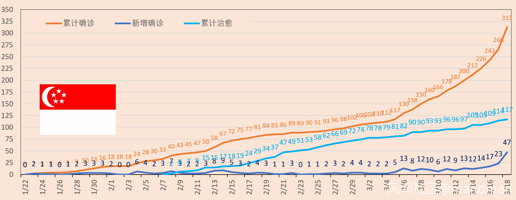 **新加坡:**新增47例,環比翻番,其中境外輸入33例,累計確診313例,百萬人口確診率為55;新增出院5例,累計出院117例;目前住院病例198例,創了新高;重症患者15例。在嚴密防控下,新加坡的病例數繼續小步增加,境外輸入日益成為新加坡不可承受之重,這是對新加坡政府抗疫工作的極大挑戰。