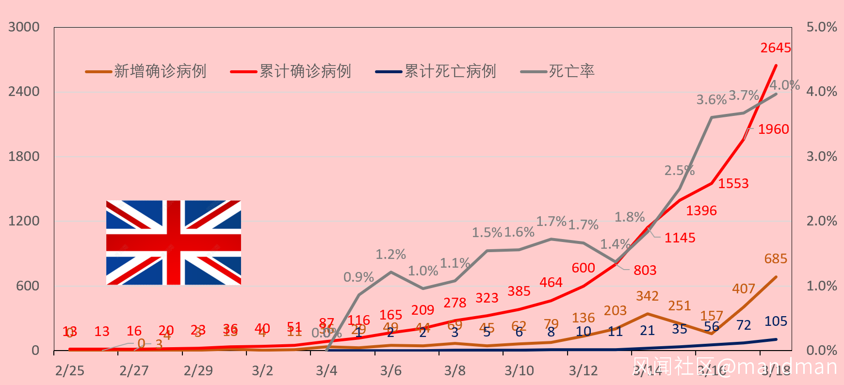 **英國:**在無情的病魔面前,“羣體免疫”大法失效了,新增685例,環比增加68%,再創新高,前三天為251、157、407例,累計2645例,環比增長35%;百萬人口確診率為40;新增死亡病例33例,累計105例,死亡率4.0%。英國的病例數嚴重偏低,新增確診病例連續下降,嚴重不符合傳染病規律,死亡率卻已經明顯上升,超過了法國。在殘酷的疫情面前,英國政府被迫放棄了“羣體免疫”政策,開始採取更積極的措施:要求所有人不要去聚會、不要去酒吧、夜總會和劇院;有可能就居家辦公;有健康問題的人自我隔離12周等,只恐怕為時過晚了。