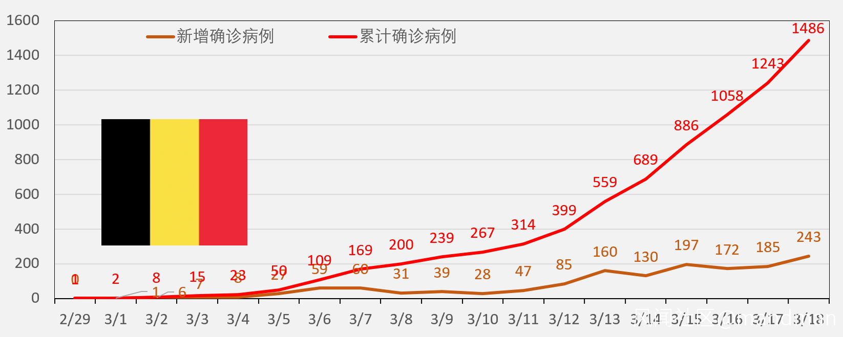 **比利時:**新增243例,前三天為197、172、185例,加速增加;累計1486例,百萬人口確診率為130;新增死亡病例3例,累計14例。