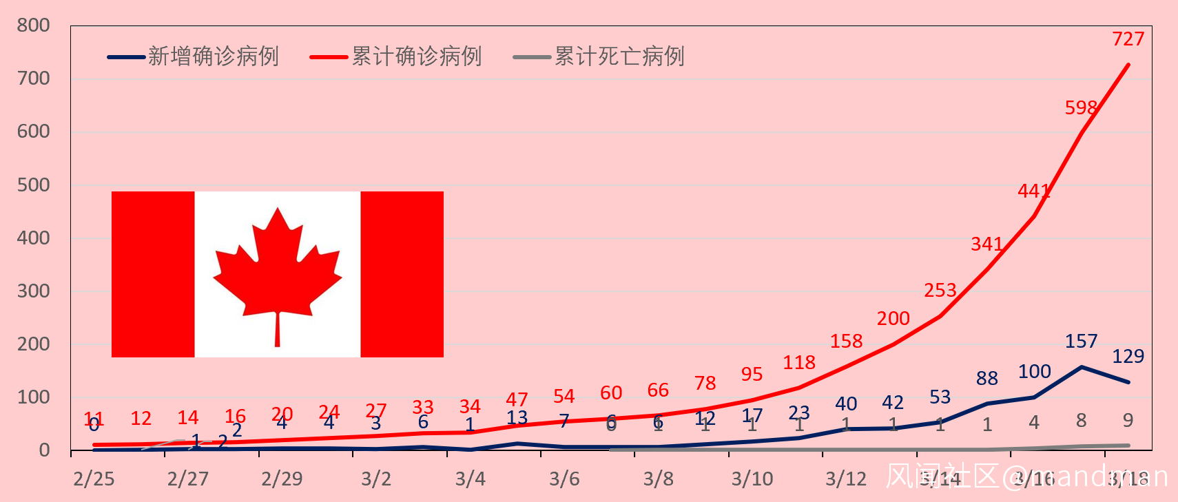 **加拿大:**新增129例,前三天為88、100、157例,呈快速增加態勢,累計727例,環比增加22%;百萬人口確診為20;新增死亡1例,累計9例。加拿大的疫情開始進入快速蔓延階段。為了控制疫情,美加兩國政府同意封鎖兩國漫長的邊境。
