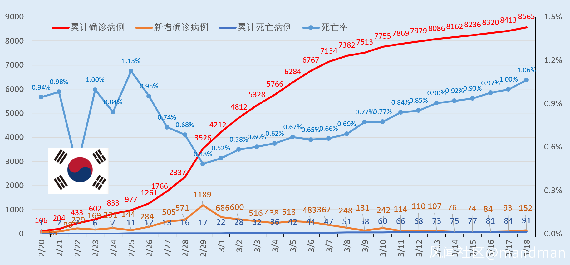 **韓國:**新增確診病例152例,環比增加63%;累計確診8565例,百萬人口確診率為166;病亡增加7例,累計91例,百萬人口死亡率為1.76,病亡率為1.06%。韓國疫情整體控制得不錯,應檢盡檢,檢測的病例數僅次於中國,確診病例低速增加,死亡病例緩慢增加,病亡率控制在1%左右,顯示抗疫工作的有效性。但京畿道一處教堂的羣發性感染,讓新增確診病例又開始迅速增加,抗疫工作來不得半點鬆懈。