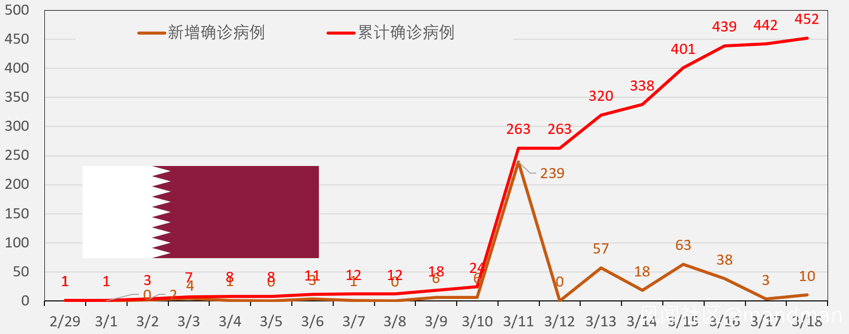 **卡塔爾:**新增10例,累計452例,百萬人口確診率為174。