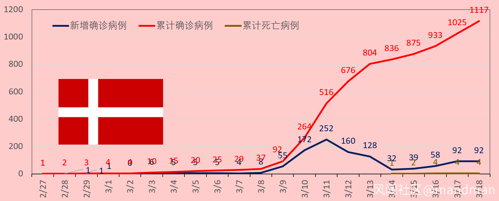 **丹麥:**新增92例,環比增加60%,前三天為39、58、92例;累計1117例;百萬人口確診率為193;累計病亡4例。丹麥自3月11****日起只檢測重症患者,數據不實。