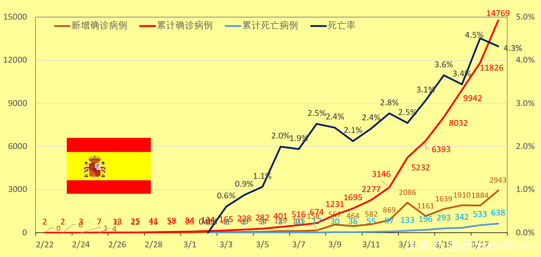 **西班牙:**新增病例數為2943例,環比增加56%;累計確診14769例,環比增加25%;百萬人口確診率為316;新增死亡病例105例,累計638例,環比增加20%;百萬人口死亡率為14;病亡率為4.3%。西班牙確診人數、死亡人數增速驚人,往意大利的道路上狂奔,西班牙政府已經宣佈將全國所有的醫療機構國有化,統一抗擊疫情,小國的無奈,可見一斑。