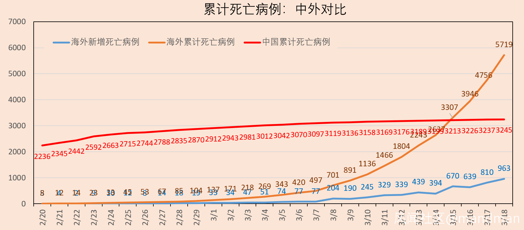 新冠疫情呈全球加速蔓延態勢,累計確診超過22萬例,病亡逼近9000例,逐漸成為1918年西班牙流感以來最嚴重的瘟疫,境外確診病例、死亡病例、病亡率已經反超境內,並加速上行。全球股市連續大跌,美股兩週內連續四次熔斷,史無前例,後續有發展成全球的債務危機、金融危機和經濟危機的趨勢。由於美、英、德、丹、瑞典、瑞士、挪威等西方發達國家坦然接受新冠病毒的廣泛傳播現實,新冠病毒疫情後續發展將更加嚴峻,這些佛系國家將持續向外輸出病原,為醫療資源更加不發達的地區帶來更大的威脅。事實證明,被動防疫的下場極其慘烈,讓病毒來教育他們吧!