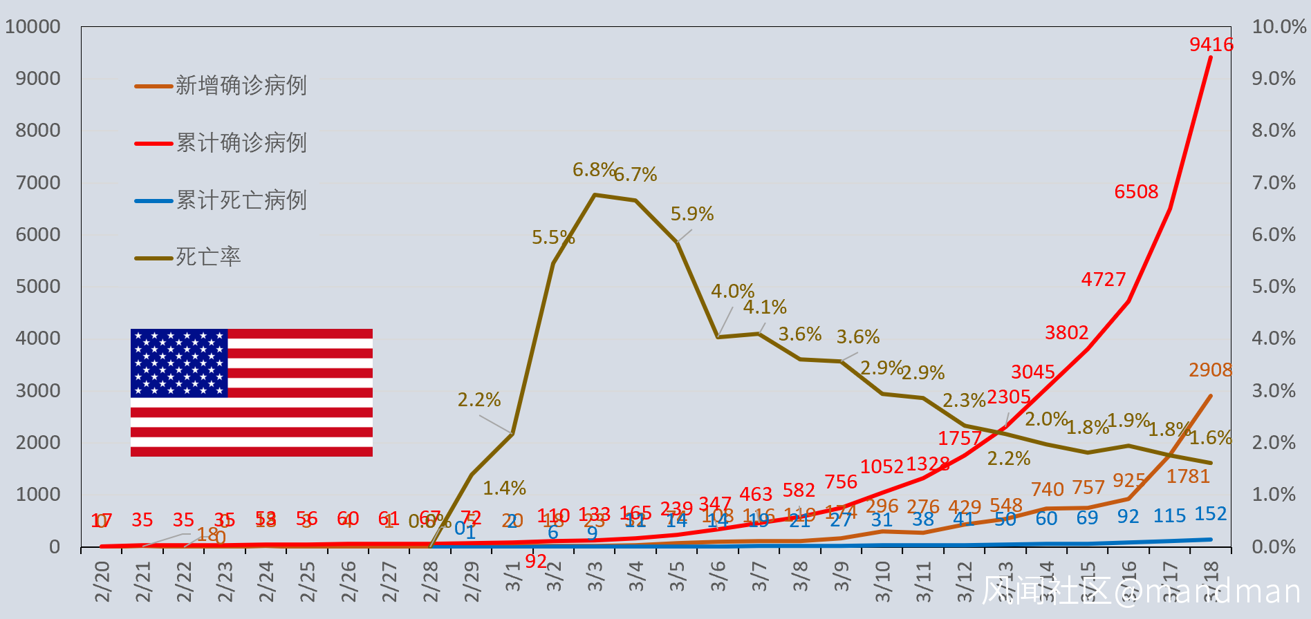 美國:新增2908例,環比增加63%,前三天為757、925、1781例,呈迅猛增加態勢,累計9416例,環比增加45%;百萬人口確診為28.8;新增病亡37例,累計152例,病亡率為1.6%。由於疫情嚴重,美國多地宣佈封城。美國的病例檢測嚴重不足,確診病例嚴重低估,預計美國後續的確診病例將出現持續爆發性增長。由於疫情失控,大統領瘋狂甩鍋,使出了種族主義的卑劣手段,令人憤慨。美股再次熔斷,這已經是兩週之內的第四次熔斷了,美國經濟後續堪憂。特朗普政府終於決定啓用《國防生產法案》,調動私營企業生產包括醫療設備在內的國防戰略物資,對抗疫情,一切似曾相識啊。