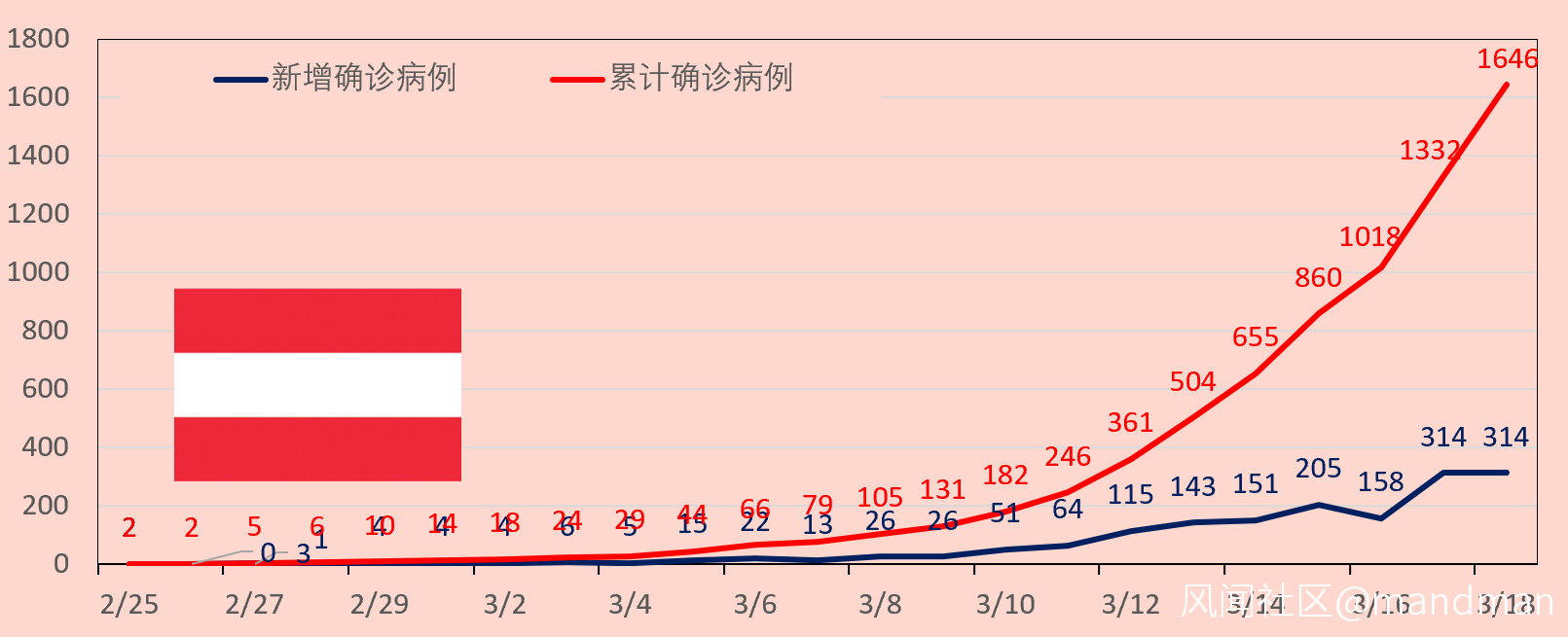 **奧地利:**新增314例,前三天為205、158、324例,快速增加;累計1646例,環比增加24%;百萬人口確診率為186;新增病亡3例,累計7例。