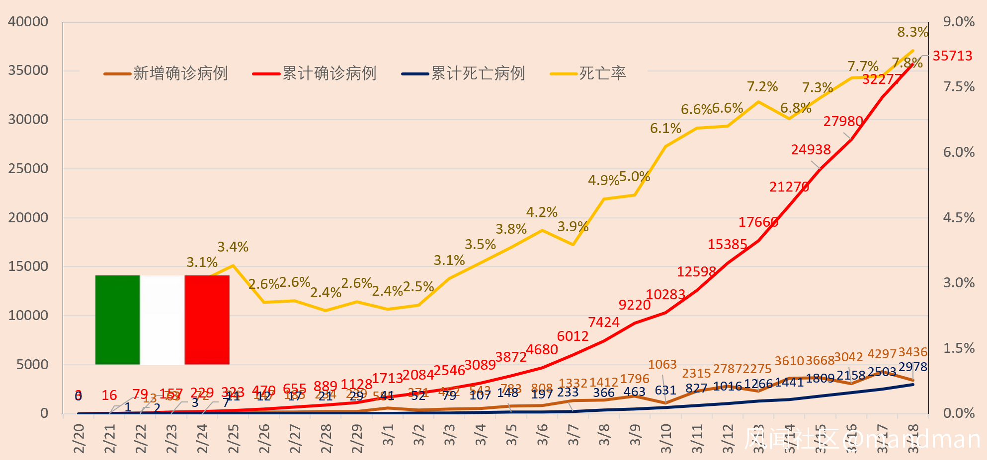 歐洲的意大利確診病例數繼續快速增加,累計病例已突破35000例,累計死亡病例接近3000例,均位列全球第二,病亡率高居全球之首,當地醫療體系全面崩潰,院內感染廣泛發生,醫院被迫根據患者的預期壽命進行選擇性收治;受意大利疫情影響,德國、法國、西班牙、瑞士、英國、挪威、荷蘭、瑞典、丹麥等歐洲多國的疫情迅速發展;西班牙已經宣佈公有化所有醫療資源,集中抗疫;迫於疫情和民意,英國的“羣體免疫”的政策已經破產;英國、瑞士、瑞典、挪威、丹麥的數據有瞞報之嫌,自欺欺人只會延誤本國的抗疫工作。
