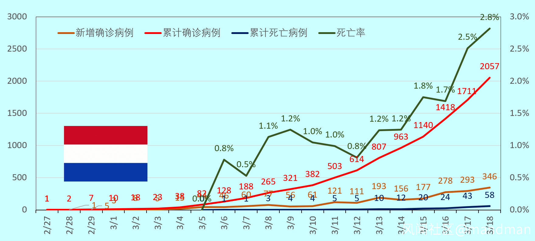 **荷蘭:**新增346例,前三天為177、278、293例,呈快速增加態勢,累計2057例,百萬人口確診率為119;新增死亡15例,累計58例,死亡率為2.8%,快速上揚。