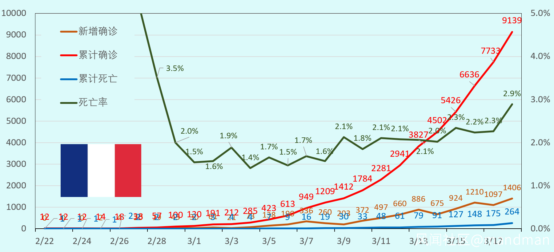 **法國:**新增病例數為1406例,環比增加28%;累計確診9139例,環比增加18%;百萬人口確診率為136;新增病亡89例,累計264例,環比增加51%;百萬人口死亡率為3.9;病亡率2.9%。法國的抗疫形勢迅速惡化,上週末頂風作案的地方選舉,要承擔極大的責任。