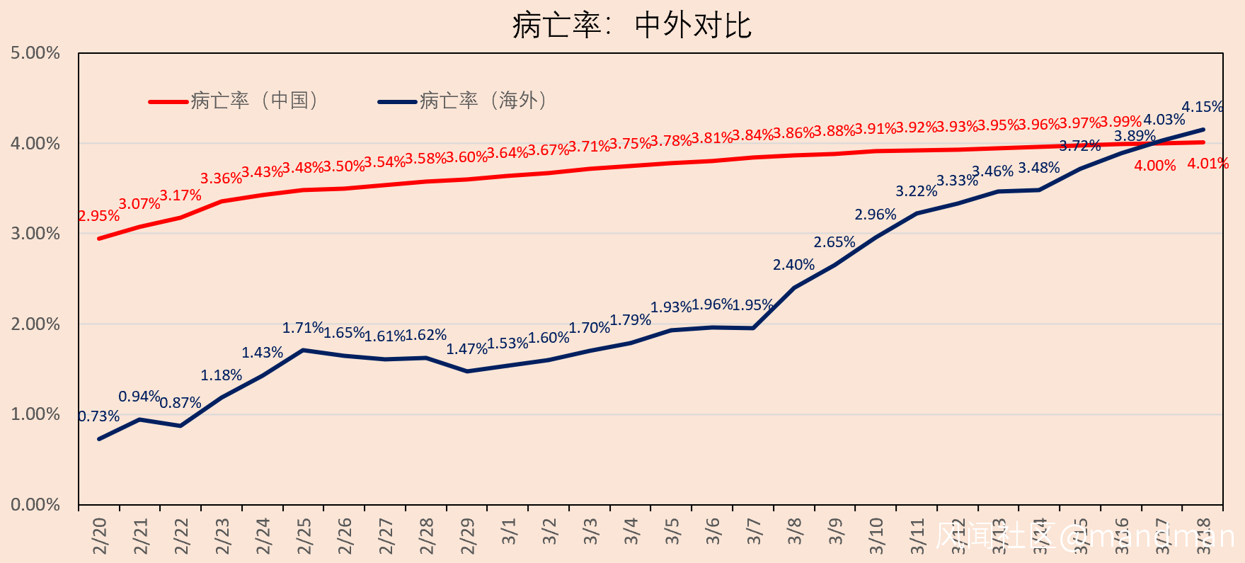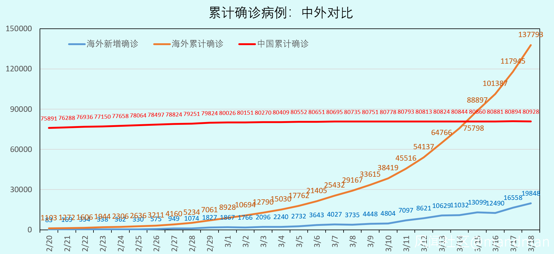 3月18日,全球(除中國)的疫情繼續惡化,新增確診19484例,環比增加20%,單日逼近20000例大關;累計確診137793例,環比增加17%,連破12萬、13萬兩個整數關,是中國的1.7倍;新增病亡963例,環比增加20%;病亡累計5719例,環比增加20%,是中國的1.76倍;粗病亡率4.15%,比中國高0.14個百分點;新冠肺炎已經蔓延到全球148個國家,比前一天增加3個。事實證明,新冠肺炎遠遠不止是一個大號的流感,4%甚至更高的死亡率才是正常的情況,中國除湖北之外的低感染率(百萬人口感染率為9.8)及低死亡率(目前是0.88%)是中國全體醫護人員努力的結果,也是全國人民努力的結果,再現的難度很大。