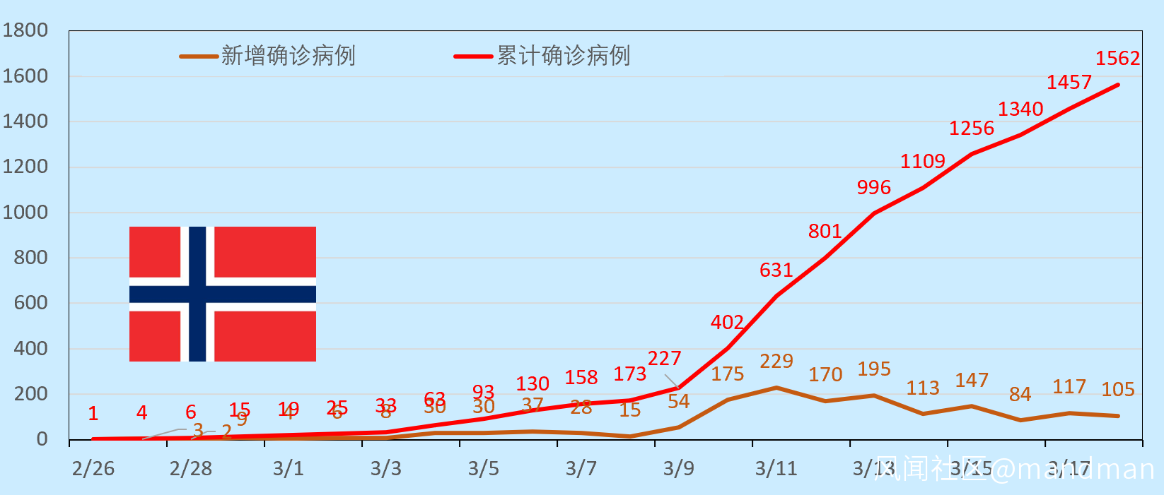 **挪威:**新增105例,前三天為147、84、117例,累計1562例,百萬人口確診率為294,僅次於意大利、瑞士。挪威自3月11****日起只檢測重症患者,數據不實。