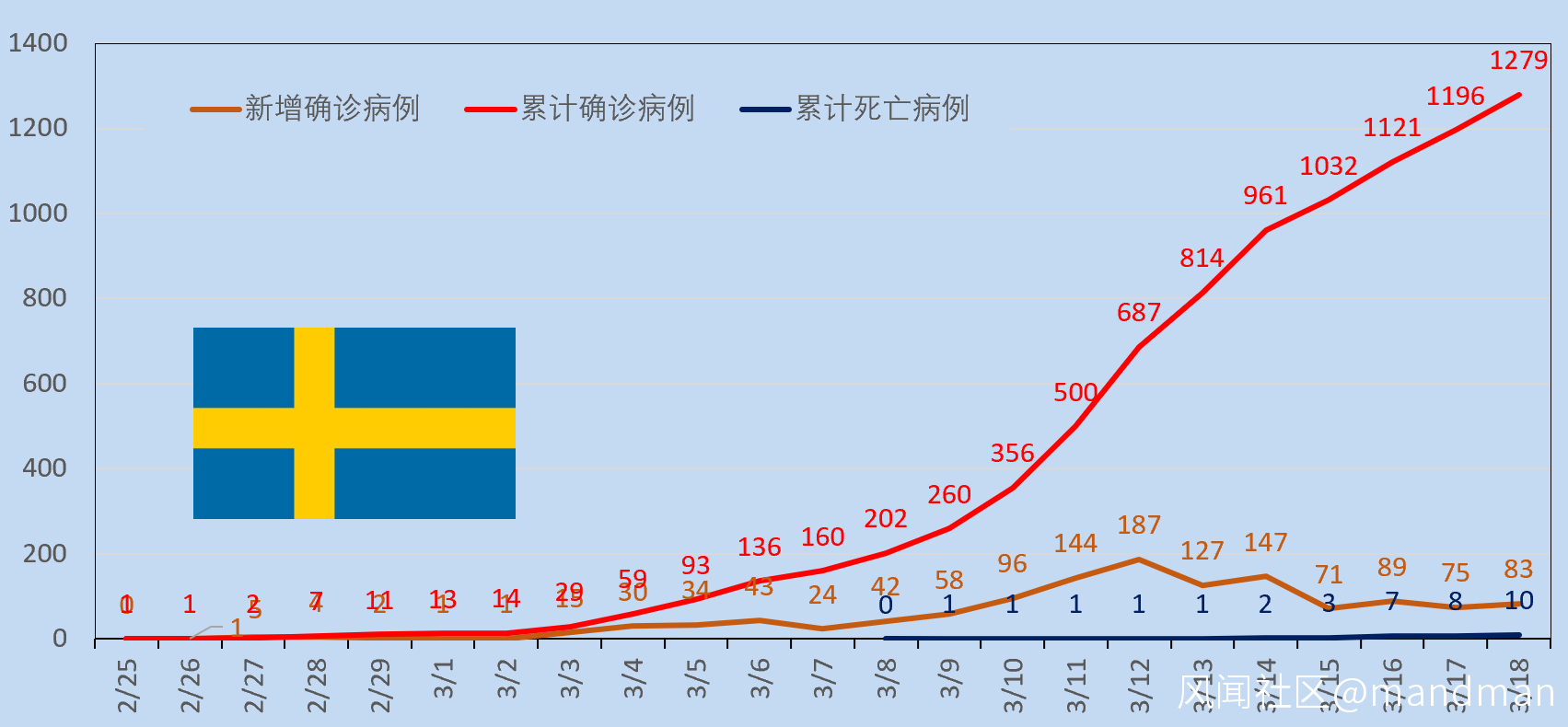 **瑞典:**新增83例,前三天為71、89、75例,累計1279例,百萬人口確診率為126;新增死亡病例2例,累計10例。瑞典自3月11****日起只檢測重症患者,數據不實。