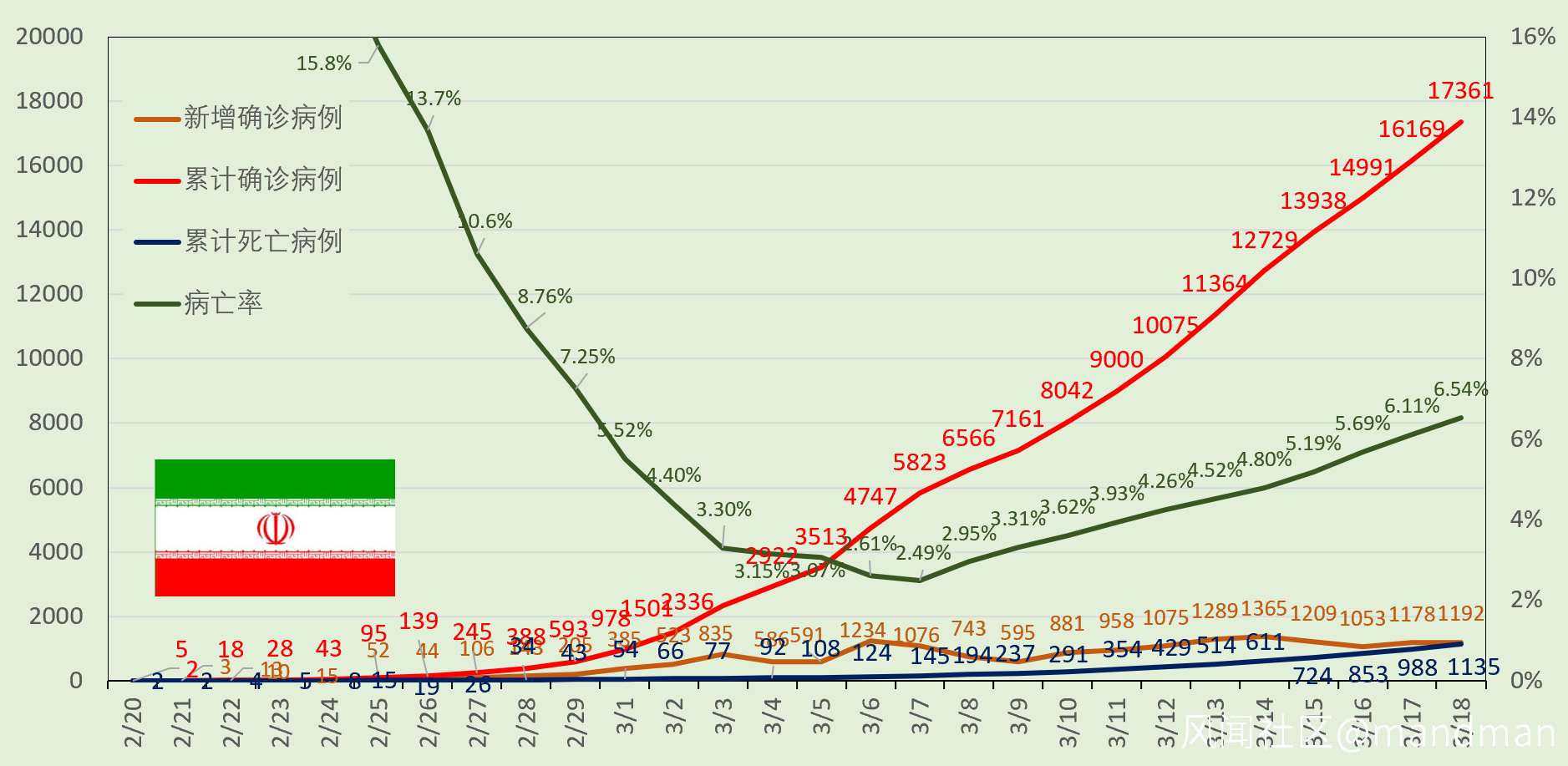 **伊朗:**新增確診病例1192例;累計確診17361例,環比增加7.4%;百萬人口確診率為212;新增死亡病例147例,累計1135例,首次突破1000例大關;百萬人口死亡率為14,病亡率為6.54%。新增病例環比重新抬頭,新增死亡病例、病亡率繼續上升,控制新增病例、治療重症患者、減少病亡,伊朗的任務十分艱鉅。