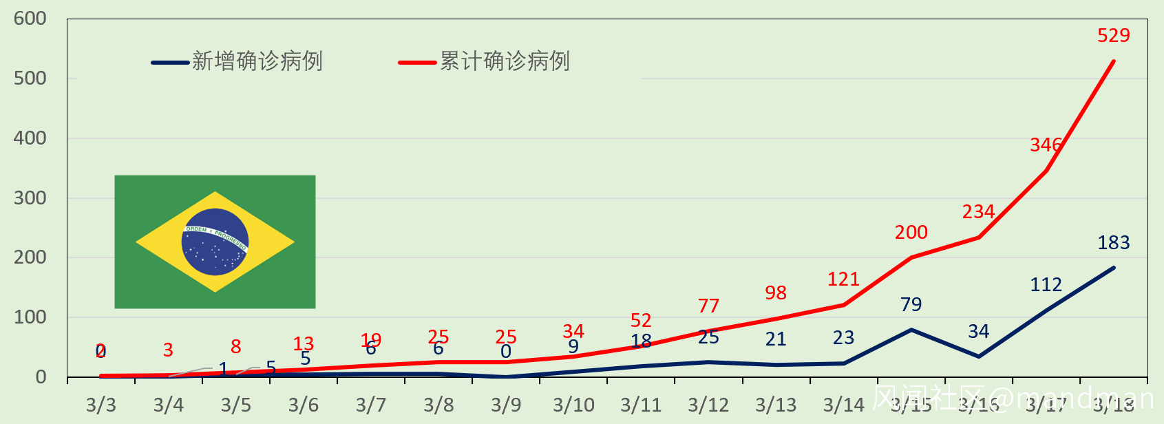 **巴西:**新增183例,環比增加66%,前三天為23、79、34、110例,呈迅猛增加態勢,累計529例,環比增加53%;百萬人口確診為2.5;新增病亡3例,累計4例。巴西的疫情尚處於早期起步階段。