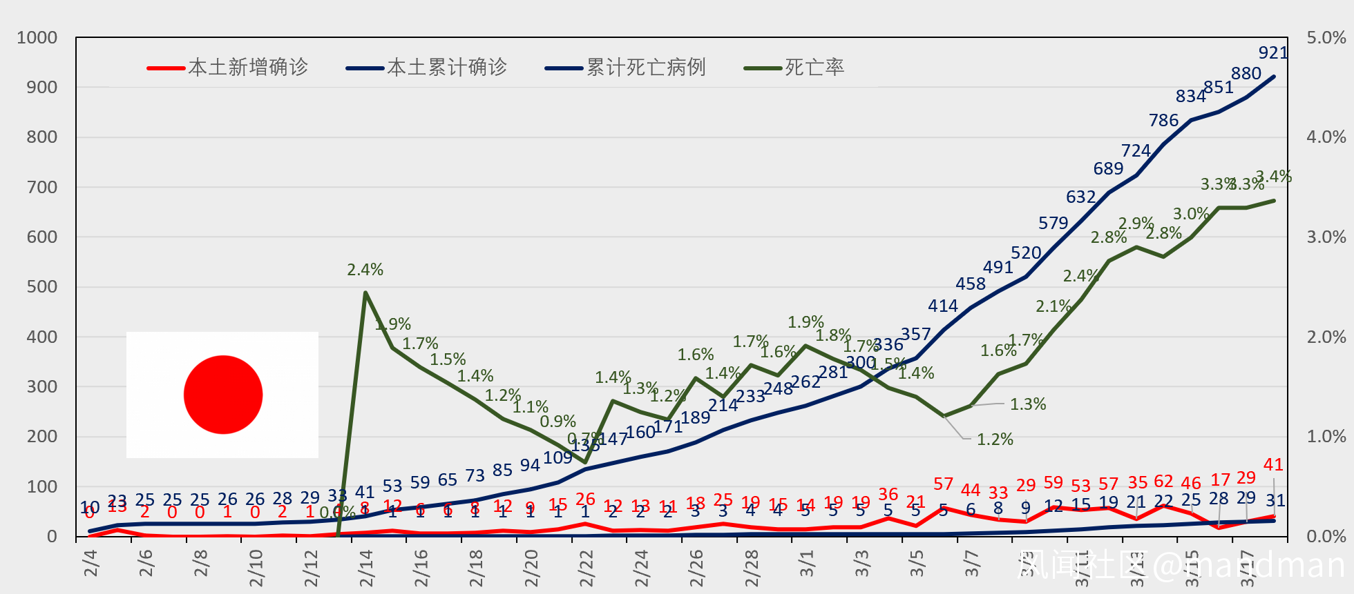 **日本:**鑽石公主號確診713例,新增16例,死亡7例;國內新增確診病例41例,累計確診921例,百萬人口確診率為7.25;新增病亡2例,累計31例,百萬人口死亡率為0.24,病亡率為3.4%。日本為了奧運,在數據上做盡文章,愚弄病毒的結果就是愚弄自己。