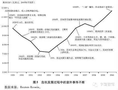 7.危機爆發後,決策者總是面臨民粹主義、民族主義和經濟問題政治意識形態化的三大挑戰,市場力量不斷挑戰令人難以信服的政府政策,這使得危機形勢更為糟糕。在面對嚴重危機的時候,主要國家在應對政策上總犯同樣的錯誤,特別是應當採取行動的時候總會錯過時機,應當採取宏觀擴張政策的時候則採取緊縮政策,應當開放和進行國際合作的時候往往採取保護主義政策,應當壓縮社會福利、推動結構改革的時候卻步履艱難甚至反覆和倒退①。這些明顯的錯誤在事後看起來顯得可笑,但對當事人來説,實施正確的政策卻困難重重。這是因為,大危機在人的一生中往往僅會遇到一次,決策者缺乏經驗,又總是面臨民粹主義、狹隘的民族主義和經濟問題政治化這三座大山,政治家往往被短期民意綁架、被政治程序鎖定和不敢突破意識形態束縛,這幾乎是普遍的行為模式,這一點在最近的希臘危機中表現得最為明顯。同時,在市場大幅波動中獲益是大金融資本的逐利本性。在一些國家軟弱的政府政策面前,國際金融市場力量往往起到“樹欲靜而風不止”的作用,這種力量又與在野的政治力量相結合,使得當政者處境岌岌可危。特別需要強調的是,兩次危機中的市場力量從來都是高度政治化的力量。如果僅從經濟角度認識問題而忽視其政治屬性,就會犯重大的判斷性錯誤。(①2012年歐債危機持續發展,法國、希臘、西班牙等國的民意普遍左轉,民族主義和極左、極右勢力明顯抬頭,大選之年政府不得不迎合民意,許多有利於債務問題解決的政策難以實施,歐債風險迅速上升。)8.危機的發展有特定的拓展模式,在它完成自我延伸的邏輯之前,不可輕言經濟復甦。在經濟危機的過程中,會發生很多意外事件,它們似乎是一些小概率事件,由運氣決定。但事實並非如此。經濟一旦從正常狀態轉入危機狀態,它就開始以一種不同尋常的方式循環。危機往往從經濟大幅跳水開始,由泡沫破裂走向失業率攀升,由經濟困境加重轉向社會矛盾激化,由經濟社會領域轉向政治領域乃至軍事領域。在這個過程中,政府面對超高的負債率,先是在財政上採取緊縮政策,去槓桿化進程開始,隨後經濟泡沫破裂所帶來的經濟壓力往往通過貨幣貶值和債務重組得以緩解。而後,在經濟未實現好轉之前,通脹上升和股市繁榮往往帶來一次虛假復甦,但很快會遇到經濟的二次探底。在1929年的大蕭條中是這樣,在這次國際金融危機中已經出現了這種跡象:美國金融危機一度出現緩解,但歐債危機卻出乎意料地全面惡化,系統風險迅速上升,全球經濟可能由此進入第二輪危險期。同樣,當國內矛盾激化到一定程度之後,就會向外部轉移和推卸責任。危機的自我拓展只有走完全過程才能達到新的平衡點,大危機一旦發生就註定是一個較長的過程。上次大蕭條最極端的情況是希特勒通過民選方式上台和第二次世界大戰爆發。當前特別需要重視的是,在危機自我邏輯實現的過程中總會出現意外事件,一連串的失控和誤判也屢屢發生。目前,歐債危機正在深化,中東形勢很不確定,經濟、政治、社會、歷史、文化等方面的衝突相互交織,在這種情況下,我們對本次危機可能出現的重大風險必須有充分的思想準備(見圖5)。