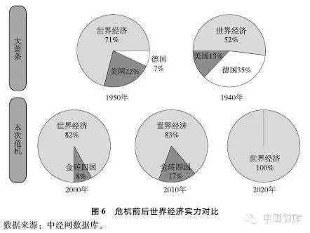 10.危機具有強烈的再分配效應,它將導致大國實力的轉移和國際經濟秩序的重大變化。“基辛格定律”可能被再次驗證。基辛格在他的名著《大外交》一書中開宗明義地指出,世界每隔百年會出現一個新的全球大國。這個判斷可能被兩次危機所證實。大蕭條後世界經濟重心由歐洲轉向美洲,美國在世界經濟中發揮主導作用,美元佔據支配地位,聯合國、國際貨幣基金組織和世界銀行誕生,世界經濟政治格局發生重大變化。這次危機發生後,全球發展的重心向亞太地區轉移,二十國集團(G20)平台產生,世界實力對比正在急劇變動,國際經濟秩序正在發生變化。從這個意義上看,危機不僅具有對生產力發展的破壞作用,也有積極的創新作用,更有強烈的再分配效應。總之,大危機所分配的不只是一個國家國內的財富,而且是國家之間實力的對比。危機的再分配效應是無法抗拒的,世界經濟秩序將繼續發生穩步但不可逆轉的重大變革(見圖6)。