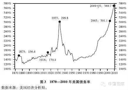 4.在公共政策空間被擠壓得很小的情況下,發達國家政府所採取的民粹主義政策通常是危機的推手。技術變革和分配差距擴大造成的心理壓力,往往會引起社會公眾的不滿,在執政期內無力改變現狀和選票政治的推動下,政府傾向於更多地採取民粹主義政策宣示,安撫民心。上次危機美國總統作出“每家的後院有兩輛汽車、每家的鍋裏燉着一隻雞”的承諾;而這次危機發生前,兩任總統都承諾提高住房自有率①。歐盟國家從20世紀90年代末以來,税收佔GDP的比重持續下降,但社會福利支出佔GDP的比重持續上升,社會福利安排出現過度化傾向,但絕大部分政治家難有決心和膽量壓縮福利。民粹主義承諾改變了大眾的福利預期,加大了對政府的依賴,也放鬆了自己的奮鬥決心,是效果極其負面的腐蝕劑。致命問題是,一旦大眾的福利預期得不到滿足,社會心理很快發生逆轉,並形成蔑視權威、拒絕變革和仇視成功者的強烈氛圍。與此同時,超出收入能力的過度財政負債和福利主義相應成為一種習慣,這種習慣在政府和民間相互影響,其破壞力在目前的歐債危機中得到充分體現。對這個問題,橋水投資基金的戴利歐先生在“和諧的去槓桿化”一文中,對政府和民間的去槓桿化過程做了精彩描述。文章認為,每隔70年左右的一次高負債都伴隨着一次經濟危機(見圖3),在這期間工資增長都超過勞動生產率的增長,負債增長都大大超過税收能力。(①在1995年美國住房與城市發展部發佈的《國家住房戰略》中,克林頓提出:“要實現住房自有率在本世紀末達到歷史最高水平”。2004年10月小布什在華盛頓競選連任的演講時提出:“任何一個家庭搬進自己擁有的房子都會感到美國比其他國家強”。)
