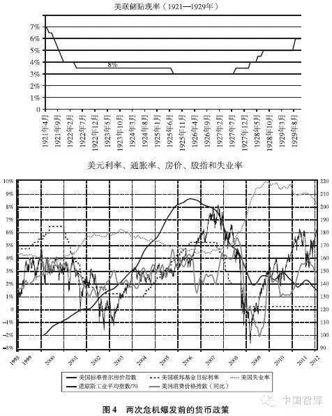 5.大眾的心理都處於極端的投機狀態,不斷提出使自己相信可以一夜致富的理由。兩次危機前的產業神話和收入分配出現的巨大差距,往往導致資本主義制度下的社會心理狀態出現變異。改變其社會地位的急切心情,使大眾都開始追求一夜暴富,人們寧願相信各種投機奇蹟,人類本性中的貪婪和健忘達到前所未有的程度,沒有多少人可以經受泡沫產業的誘惑,社會心態浮躁具有普遍性,在寬鬆貨幣環境和以提高槓杆率為實質的金融創新助推下,大量舉債進行高風險投機,產生了巨大的資產泡沫,大蕭條前主要是股市泡沫,這次危機前是房地產泡沫。正如加爾佈雷思所描述的,當經濟處於過度繁榮狀態的時候,沒有人不相信泡沫會繼續膨脹,人們不是找出理由使自己理性,而是找出理由使自己相信盲目冒險的正確性。可以肯定的是,在特定的歷史階段和制度條件下,人類這種自我膨脹的説服力量和缺乏理性是導致危機的重要原因。由此我們也可以提出一個相關的質疑:經濟學關於理性人的假設是否具有永恆性?6.兩次危機都與貨幣政策相關聯。在兩次危機之前,最方便的手段是採取更為寬鬆的貨幣信貸政策。大蕭條前,氾濫的信貸政策引起了股市的泡沫和投機的狂熱;在這次危機前,美聯儲極其寬鬆的貨幣政策、金融放鬆監管和次級貸款都達到前所未有的水平,使得經濟泡沫惡性膨脹。在經濟泡沫導致消費價格上漲的壓力下,貨幣當局不得不採取緊縮貨幣政策,從而捅破了泡沫,改變了投機者的心理預期,使得遲早發生的事終於發生(見圖4)。兩者的主要區別在於,1929年大蕭條還沒有明確的宏觀經濟理論指導,而本次金融危機則是宏觀經濟政策長期服從於政治選舉目標。兩者的共同之處在於,貨幣當局對宏觀經濟形勢都缺乏準確的理解,大蕭條時期美聯儲的決策者基本沒有總需求管理的意識,而這次美聯儲則對已經全球化的世界經濟與美國作為儲備貨幣國所應該執行的貨幣政策認識很不到位。
