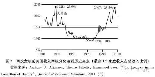 3.收入分配差距過大是危機的前兆。兩次危機發生前的另一個共同特點,是較少數的人佔有較多的社會財富(見圖2)。大蕭條期間所表現出的,是私人佔有和社會化大生產之間的矛盾,表現形式是實體經濟產能過剩和有效需求不足。這一次危機則與全球化、互聯網和知識經濟的發展、經濟虛擬化程度提升、不同國家人口結構的變化有更多關係。但最突出的表現是,生產資料名義所有權和實質支配權分離,權力集中到虛擬經濟領域極少數知識精英手中。分配差距也不僅表現在一個國家內部不同的社會羣體之間,而且表現在傳統的發達國家和新興市場國家之間。在全球化和互聯網全面發展的過程中,世界經濟形成了相互依賴的三角形循環,新興市場國家成為全球製造中心,資源富足國家提供原材料和能源,發達國家通過負債消費,拉動新興市場國家產能利用。雖然形式上的變化很多,但是產能過剩和有效需求不足的矛盾仍然是主要矛盾。