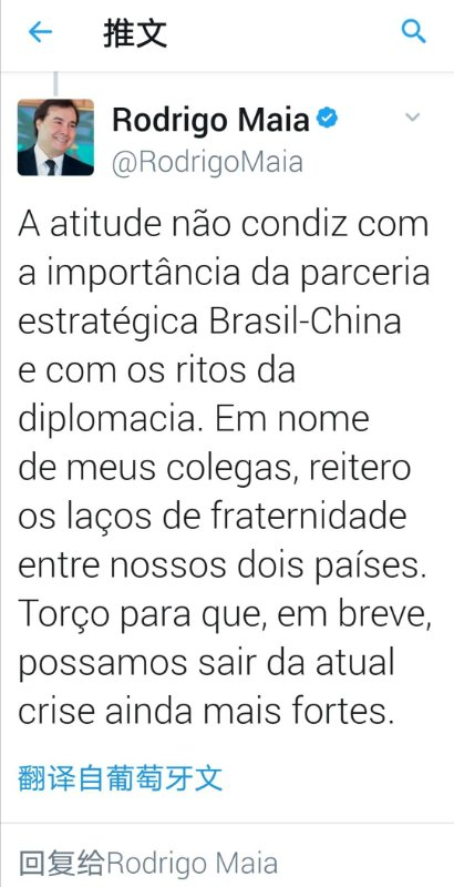 楊萬明大使的回應當即得到了巴西網民的積極響應。隨後巴西眾議長羅德里戈·馬亞也直接出面發文,替愛德華多道歉。
