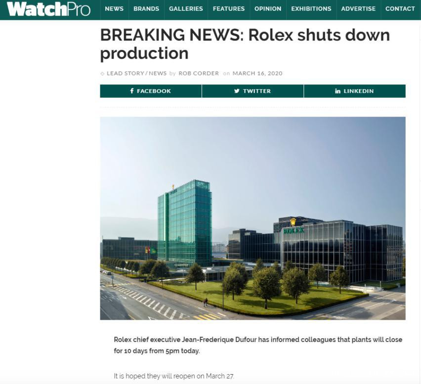 在這樣的嚴格命令下,近幾日奢侈品集團的官方聲明紛紛見諸報端,最早引發震動的聲明來自於知名腕錶品牌勞力士,在3月16日,官方即發表聲明表示將於歐洲中部時間3月17日下午5點開始關閉位於日內瓦(Geneva)、比爾(Bienne)和克里斯塞(Crissier)的工廠直至3月27日,之後視疫情發展的情況決定是否繼續延期開工,分析指出,此舉可能會導致勞力士減產超過兩萬只腕錶。