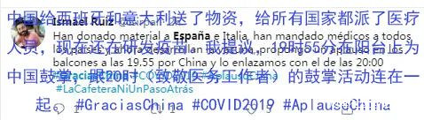 目前,西班牙網民已經在社交網站上發起“感謝中國”活動,“感謝中國(#GraciasChina)”的熱詞標籤刷屏推特。