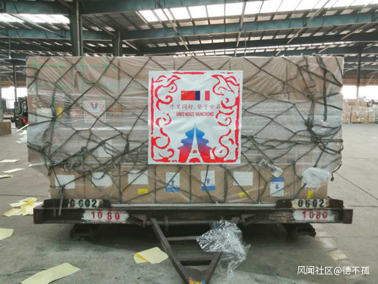 “千里同好,堅於金石”、“UNISNOUSVAINCRONS(團結定能勝利)”這是寫在中國政府援法醫療物資上面的中法兩國名言,配以寓意吉祥的鳳凰和象徵和平的鴿子圖案,體現了中法共同抗擊疫情,護佑中法兩國友好關係。近一段時間,隨着新冠肺炎的全球蔓延,中國各界也源源不斷的向國際社會進行防疫抗疫物資援助。