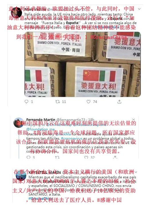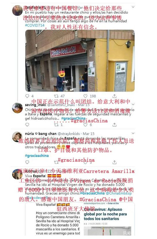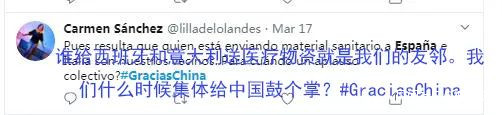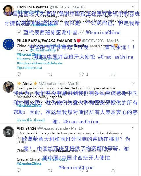 目前,西班牙網民已經在社交網站上發起“感謝中國”活動,“感謝中國(#GraciasChina)”的熱詞標籤刷屏推特。