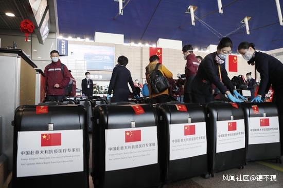 17日出發到意大利協助應對疫情的專家組一行9人攜帶包括呼吸機、監護儀、雙通道輸液泵等ICU裝備各30套,便攜式彩超2套,實驗室檢測試劑6萬人份,還有一批防護物資、常用藥品等共計9噸。圖為3月17日,即將奔赴意大利的浙大一院專家。來源:錢江晚報