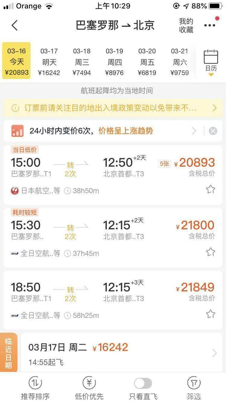 回國的機票從學校停課開始就漲得厲害,24小時提價16次。幸好我訂票及時,買到了北京時間18日凌晨的航班,從巴塞羅那轉機到迪拜,停留20個小時,再飛北京,在飛機上的時間,我就打算不吃不喝,等中轉的時候再找個沒人的地方吃東西。我買的價格是3500元人民幣,我舍友猶豫了兩天,價格突破1萬了,現在已經超過2萬了。