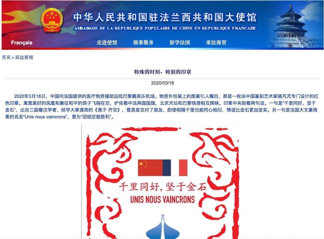 勒德里昂當天在接受法國商業調頻電視台採訪時説,中國在國內疫情緩解的情況下,向法國提供口罩、手套等醫療物資援助。援助物資於18日和19日分兩批空運至法國。