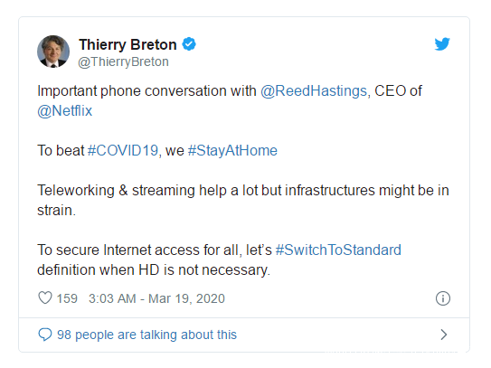 為了延緩COVID-19病毒的傳播速度,越來越多的城市開始通過互聯網進行工作,因此快速、穩定的網絡連接比以往任何時候都顯得更加寶貴。歐盟委員會的一名官員表示,布雷頓和哈斯廷斯討論了防止互聯網出現擁堵的方法,例如創建一個臨時的功能,在流量高峯時段自動將用户播放的視頻從高清晰度切換到標準清晰度。報道稱,布雷頓和哈斯廷斯將在未來幾天後再次進行對話。
