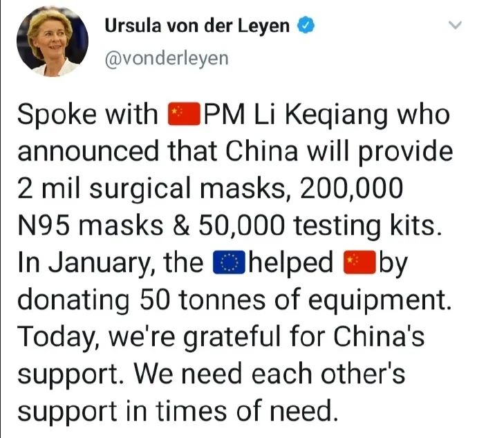 馮德萊恩當天在歐委會官方社交媒體上發表講話時説:“今年一月新冠肺炎疫情在中國暴發時,歐盟向中方提供了50多噸抗疫物資。現在,歐洲成為了疫情中心並且急需防護物資,中國沒有忘記我們所給予的幫助,將向歐盟緊急提供200萬副外科口罩、20萬副N95口罩和5萬套病毒檢測試劑盒。中國的支持非常寶貴,我對中方表示衷心感謝!”