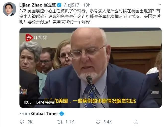 “美國疾控中心主任被抓了個現行。零號病人是什麼時候在美國出現的?有多少人被感染?醫院的名字是什麼?可能是美軍把疫情帶到了武漢。美國要透明!要公開數據!美國欠我們一個解釋!”