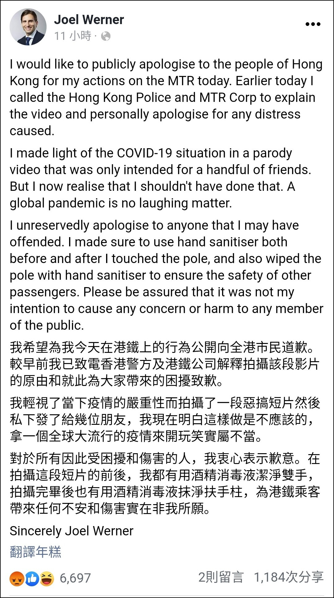 該網友稱,自己輕視了當下疫情的嚴重性而拍攝了一段惡搞短片,又私下發給了幾位朋友。他已經明白網傳視頻中的行為是不應該的,拿一個全球大流行的疫情來開玩笑實屬不當。他早前已經致電香港警方及港鐵公司解釋並致歉。