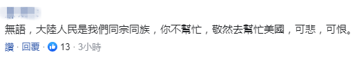 還有網友對此表示“無語,”“大陸人民是我們同宗同族,你不幫忙,竟然去幫美國,可悲,可恨。”