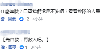 也有網友稱,“什麼嘴臉?口罩我們還是不夠啊,看看排隊的民眾”,也有人呼籲,“先自救,再救人吧。”