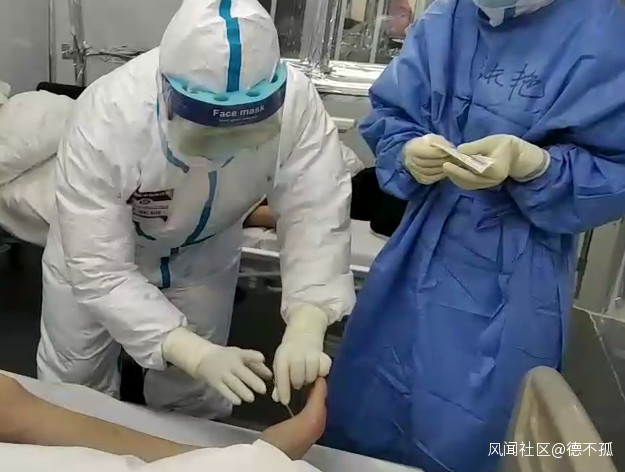 81歲的重症患者吳阿婆讓醫療隊員印象深刻。她是C7病區開科收治的第一批病人,由救護車送來,四位救護大隊工作人員擔架抬入。“入院時吳阿婆根本説不動話,只是在不停呻吟”。王振偉回憶到,“當時我給她測了氧飽和度才69%!CT顯示兩肺瀰漫性改變,2/3以上肺野累。此外,還合併糖尿病、高血壓、腎功能不全、低蛋白血癥、低鉀血癥等。我和當班護士對視一下,我們知道這意味着什麼!”