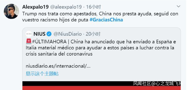 一名西班牙網友寫道,“特朗普對我們像對害蟲一樣,而中國卻給了我們幫助。你們還要繼續那些種族主義言論麼?”